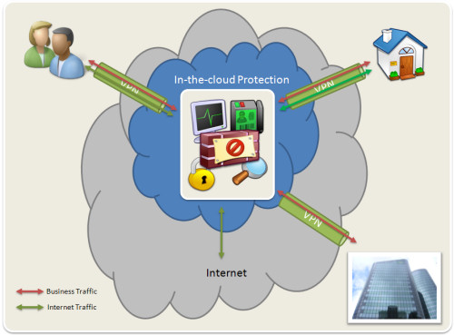 Rather than the client organization hosting the protection appliances and technologies at the perimeter of their enterprise (as well as every remote office location), the same protection technologies are effectively transplanted to the MSS services operation “in-the-cloud”. All outbound office traffic passes through a secure VPN (or equivalent secure pipe) directly the MSS providers in-the-cloud protection framework (The network traffic can't go anywhere else). The management portals with their configuration and reporting options all look the same, and effectively the client organization notices no difference in service delivery capabilities. Enablement The provision of “in-the-cloud” protection will have a number of critical advantages: