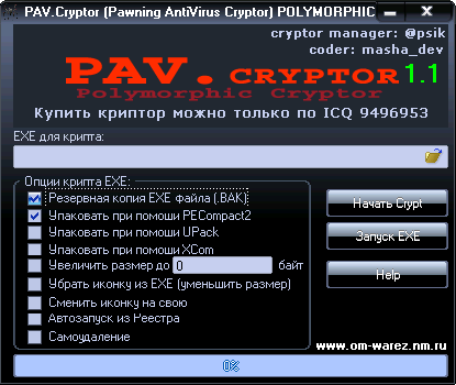 And, to round off things (for now) you could always download tools such as PAV.cryptor to turn your previously generated piece of malware into something more sophisticated by adding polymorphic adaptation capabilities for the low price of 48 WMZ.