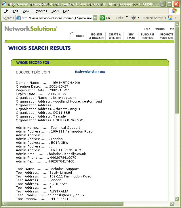 It is interesting to note that the ABC Example web site can be accessed using the www.abcexample.co.uk domain name. A query of the WHOIS server responsible for managing .co.uk domains (whois.nic.uk) reveals the following: