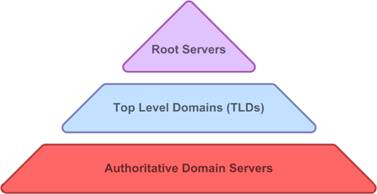 Core to DNS functionality is a hierarchical architecture of servers providing linking information to ever more informative and specific servers.  This can be visualised as a simple pyramidal structure with information flowing from the top “Root Servers”, through to the “Top Level Domain” servers and finally onto the “authoritative” domain servers.