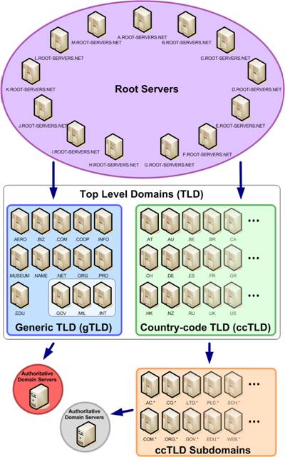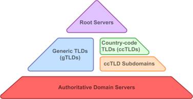 The Top Level Domain server’s role is to point DNS resolvers to an Authoritative Domain server.  The TLD layer in the pyramid is actually are divided into two distinct classes – Generic TLDs (gTLD) and Country-code TLDs (ccTLD) – with the ccTLD’s also having a range of subdomain servers.