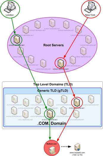 Consider a customer who wishes to connect to the online web banking service of MyBank Limited which has been designated the name www.mybank.com. (frequently referred to as a “Fully Qualified Domain Name” or FQDN) by that organisation.  The IP address of the host is controlled by the company MyBank and is stored within a DNS server under that organisations control.  In order for the customer’s web browser software to connect to www.mybank.com, it must first discover the IP address of the web server by querying MyBank’s DNS server.  However, the customer’s computer most likely will not know the IP address of the DNS server, and must first uncover these details before it can actually query it.  To find out the DNS servers address, a number of queries must be made to other servers that contain details of how to reach it.