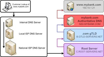 Firstly the user’s computer will require a DNS resolver to connect to a known root server (sometimes referred to as “.” (dot) servers) and obtain the details of a server that knows about .com. addresses.  The root server will thus provide details of an appropriate Top Level Domain (TLD) server, which is then queried by the DNS resolver for details about the authoritative .mybank.com. address.  Finally, the resolver queries the organisations authoritative DNS server for the IP address of the “www” host (full name www.mybank.com), and the user can then use this IP information to connect to the web banking host.