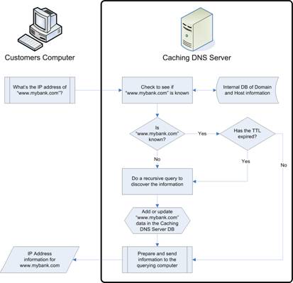 The mechanism of temporarily storing lookup information is called Caching, and it is designed to allow a DNS server to respond faster to multiple queries for the same domain or host information.  DNS servers that operate in this manner are referred to as Caching DNS servers and are often configured to carryout recursive lookups.  Operating in this way, the caching DNS server will first check its current database of lookups for domain or host information.  If this information has not expired (checked by reviewing the TTL of the entry), the caching server will provide the requesting computer with this stored information.  If the TTL has expired, or the DNS server does not have any knowledge of the domain or host, it would then conduct a recursive lookup to find the correct information.  Once found, the caching DNS server would add the information to its database and pass the information back to the requesting computer.