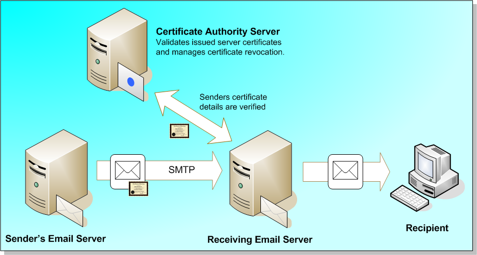 Mail server authentication – DNS querying of MX records Alternatively, through the use of Secure SMTP, email transport could be conducted over an encrypted SSL/TLS link. When the sender mail server connects to the recipient mail server, certificates are exchanged before an encrypted link is established. Validation of the certificate can be used to uniquely identify a trusted sender. Missing, invalid or revoked certificates will prevent a secure connection from occurring and not allow delivery of emails. If desired, an additional check with the DNS server can be used to ensure that only authorised mail servers may send email over the secure SMTP connection.